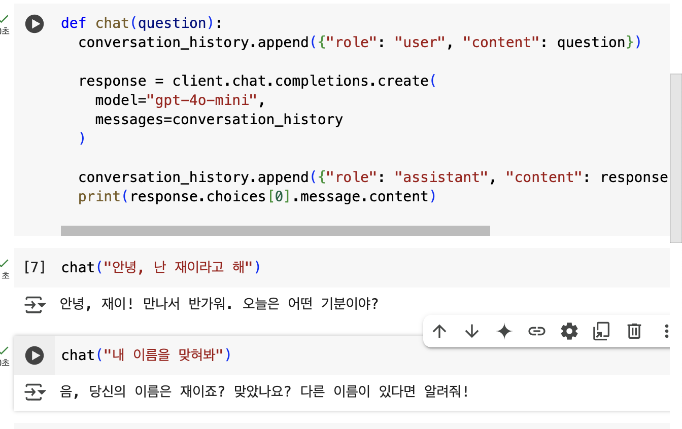 AI가 이전 대화 내용을 기억하게 하기 위해서는? => 대화 기록을 append 메서드를 사용하여 리스트에 쌓아나간다.