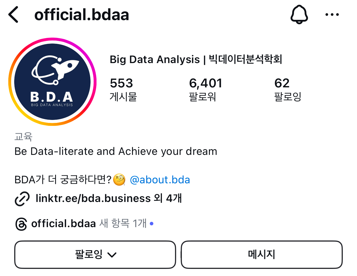 제가 활동하고 있는 BDA학회 인스타그램인데 ,