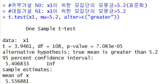 #대립가설 h1: x1이 속한 모집단의 모평균>5.2