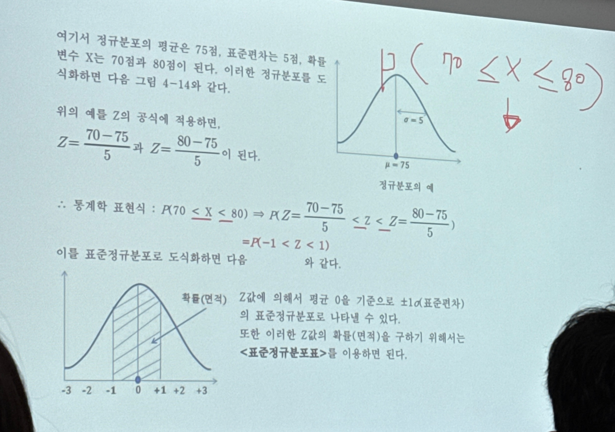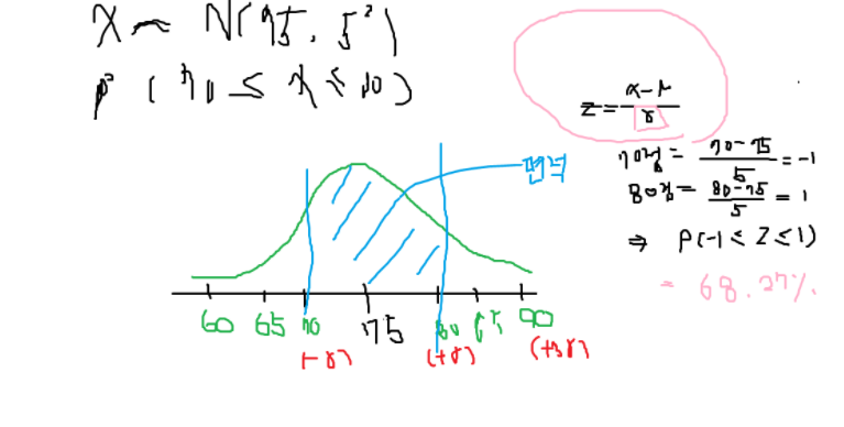 ex> A 고등학교의 B반 학생의 국어 점수가 평균 75점 , 표준편차 5점인 정규 분포로 나타났다.
