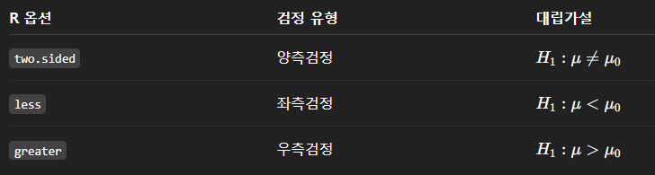 | alternative 가설의 형태(대립가설 방향) |