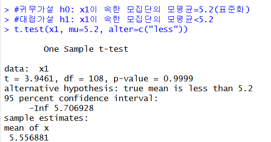 t.test(x1, mu=5.2, alter=c("less"))