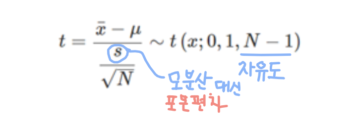 - 표본 x1 , …, xn 에서 계산한 표본 평균을 표본 표준편차로 정규화한 값을 t 통계량