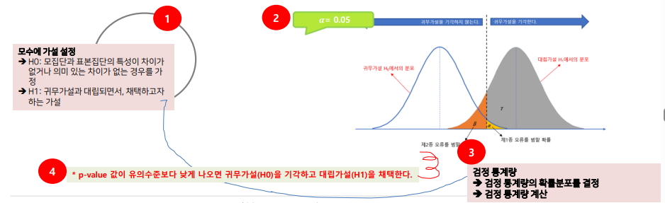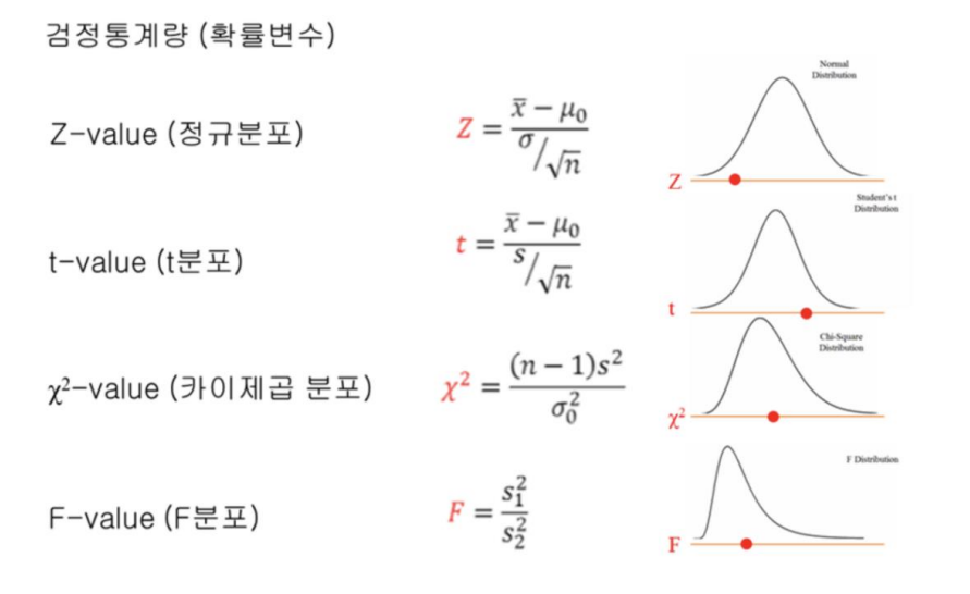 - 검정통계량을 이용해 p-value(귀무가설이 옳다는 전제하에 통계량보다 크거나 작은값이 나올 확률)를 계산한다.