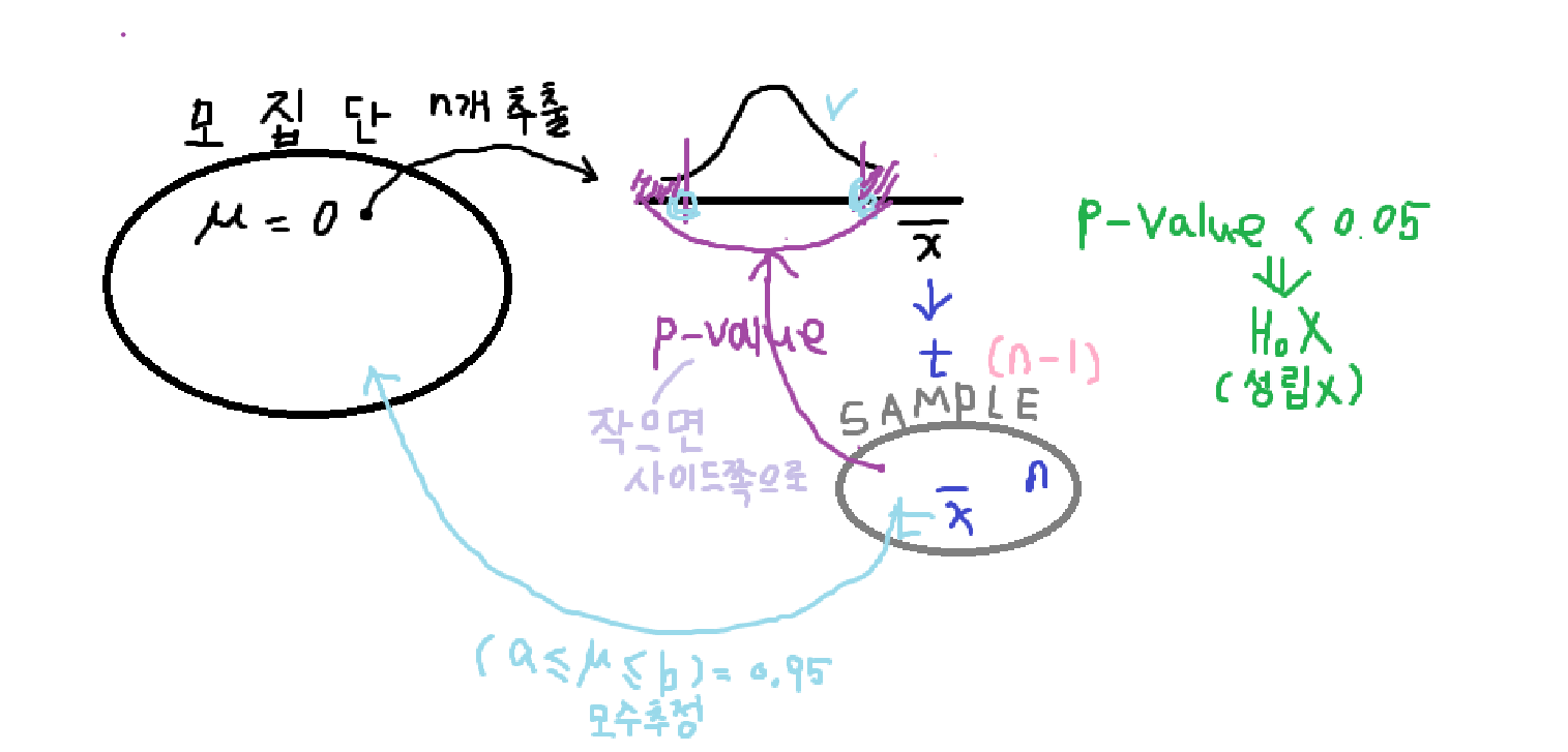 정규성이 따를 때 포본이 포함되어있다고 가정한 모집단의 평균은 0이다 라는게 가설검정