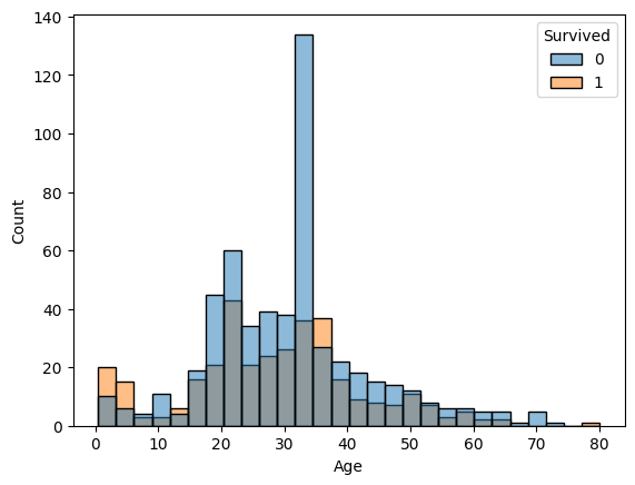 sns.histplot(x='Age', data = titanic, hue = 'Survived')