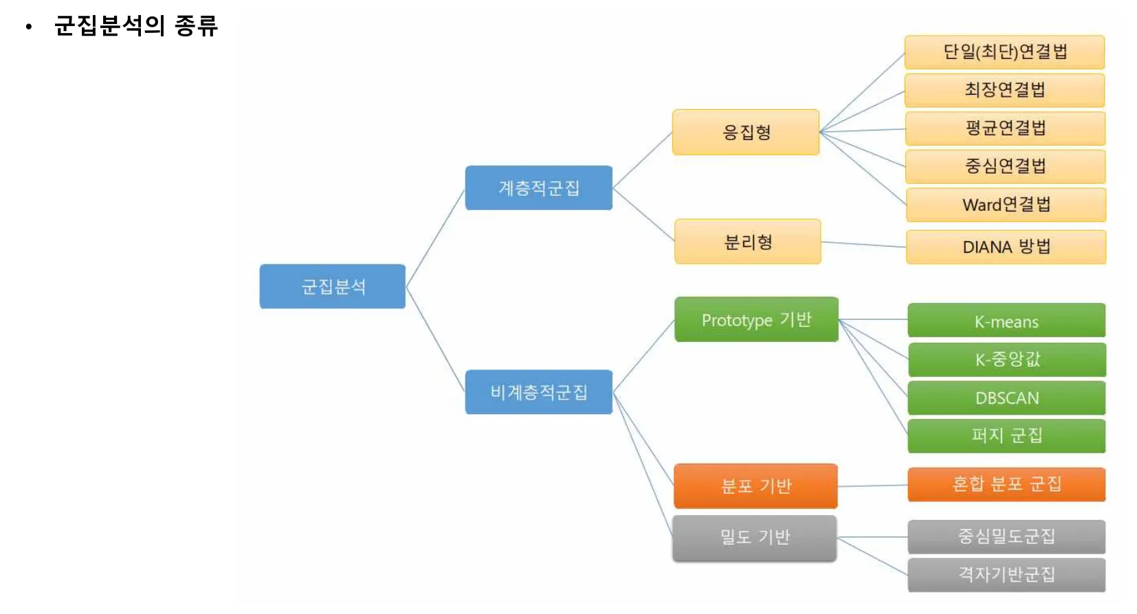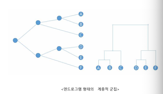 - 분할정 방법 : 하나의 큰 군집에서 작은 군집으로 분할해 나가는 방식