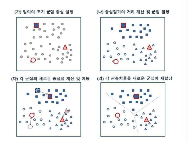- 주어진 데이터를 k개의 클러스터로 묶는 알고리즘