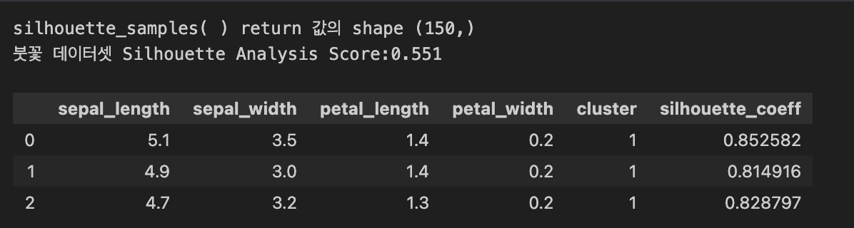 print('silhouette_samples( ) return 값의 shape' , score_samples.shape)