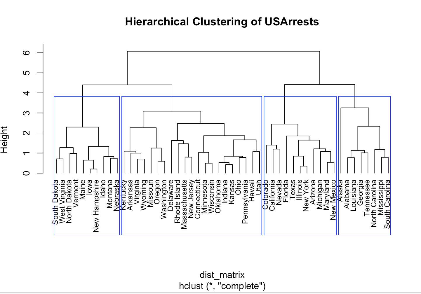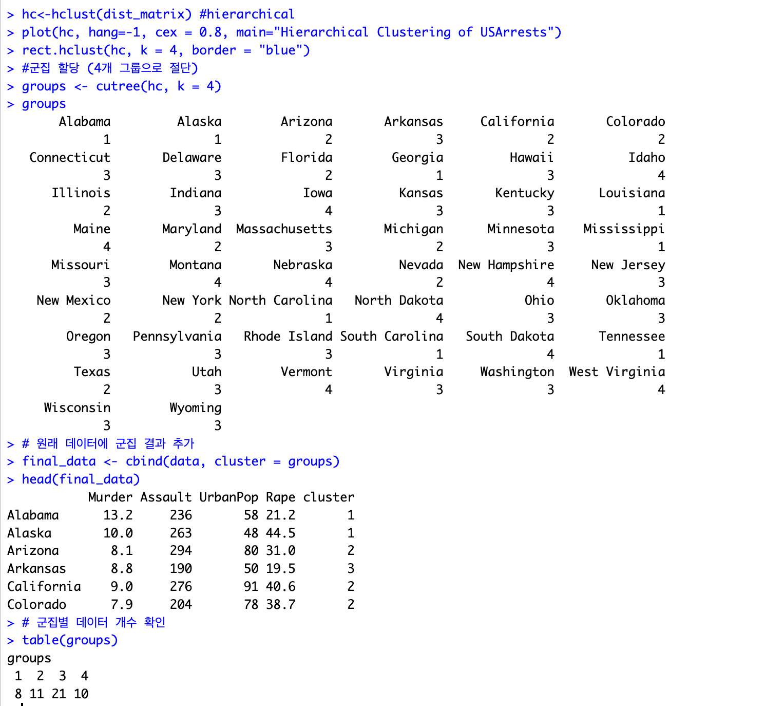 - cluster 4는 도시 인구율도 낮고, 모든 범죄에 대한 비율이 가장 낮게 나타난다. 이는 가장 안정적인 비도시적 지역으로 예상할 수 있다.