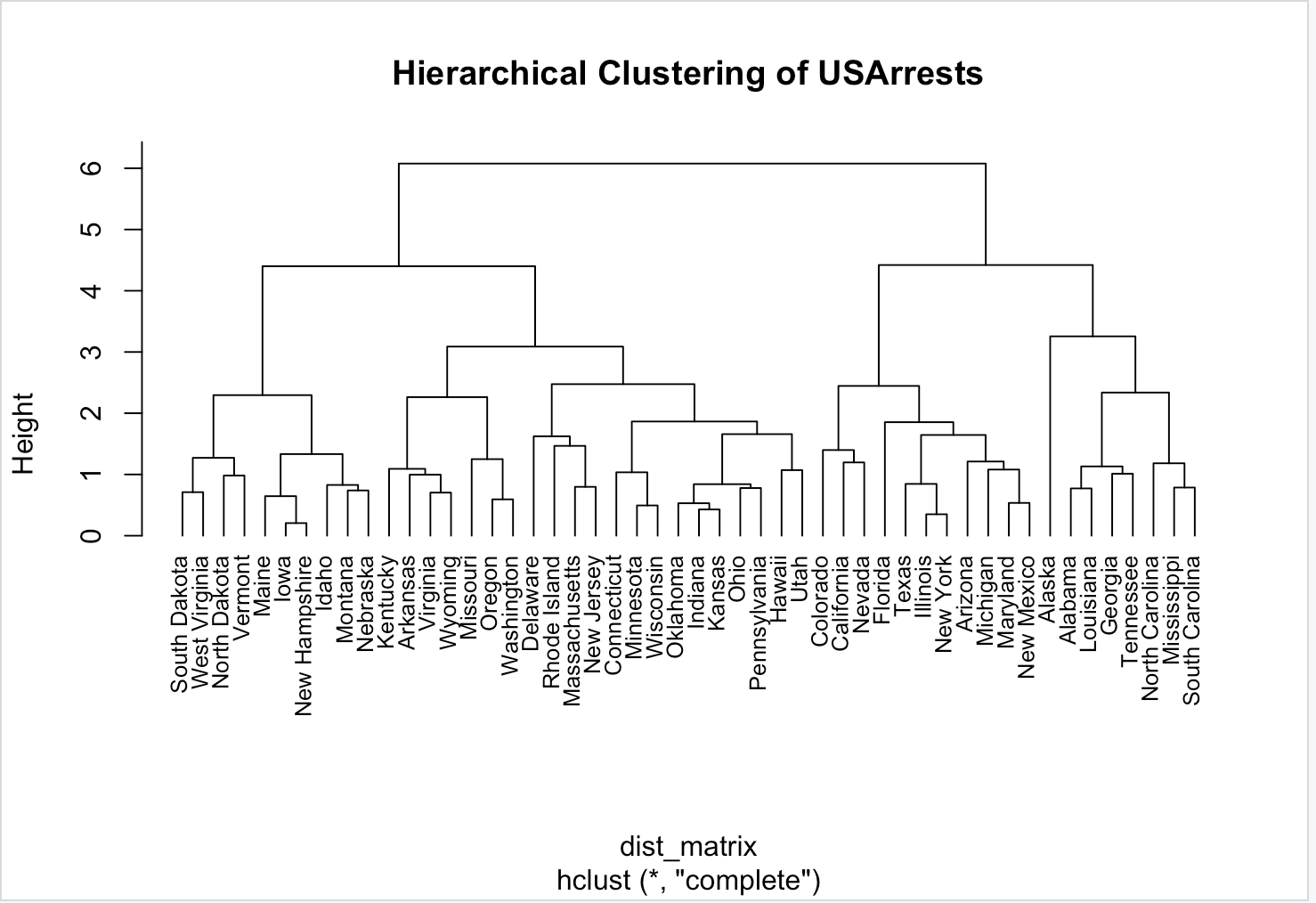 plot(hc, hang=-1, cex = 0.8, main="Hierarchical Clustering of USArrests")