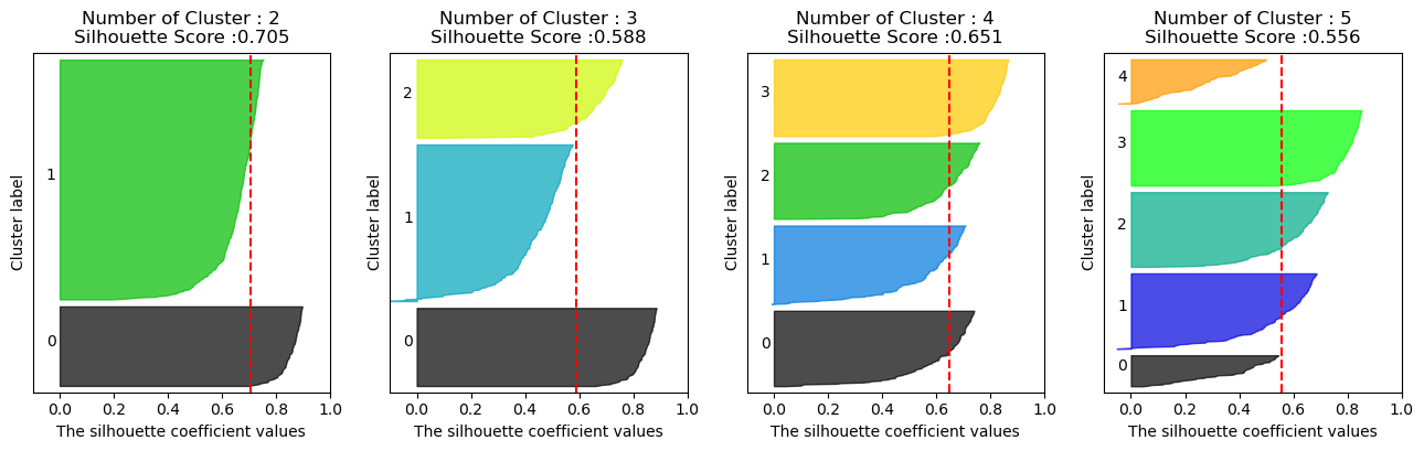 visualize_silhouette([ 2, 3, 4, 5], X)