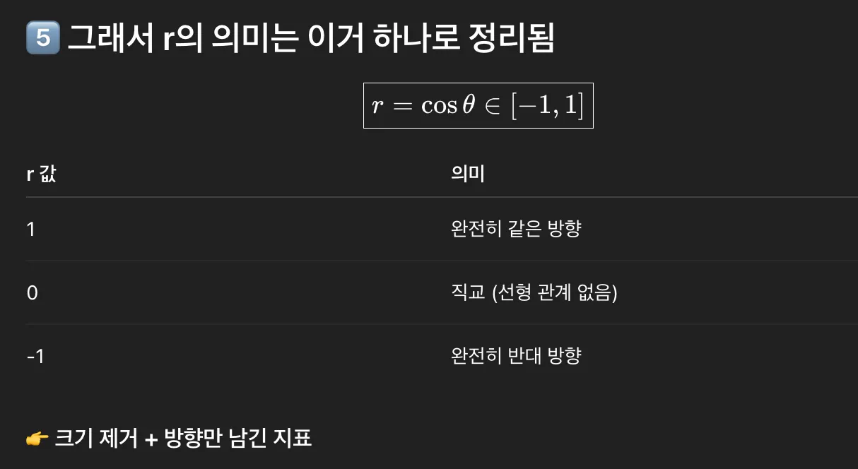 - 상관계수 : [-1,1] / 단위 없음 / 방향 + 강도
