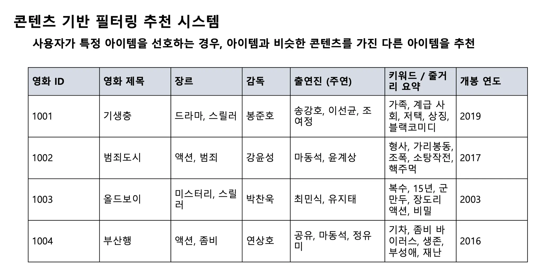 - 콘텐츠 기반 ⇒ 아이템 특성 정보 꼭 필요
