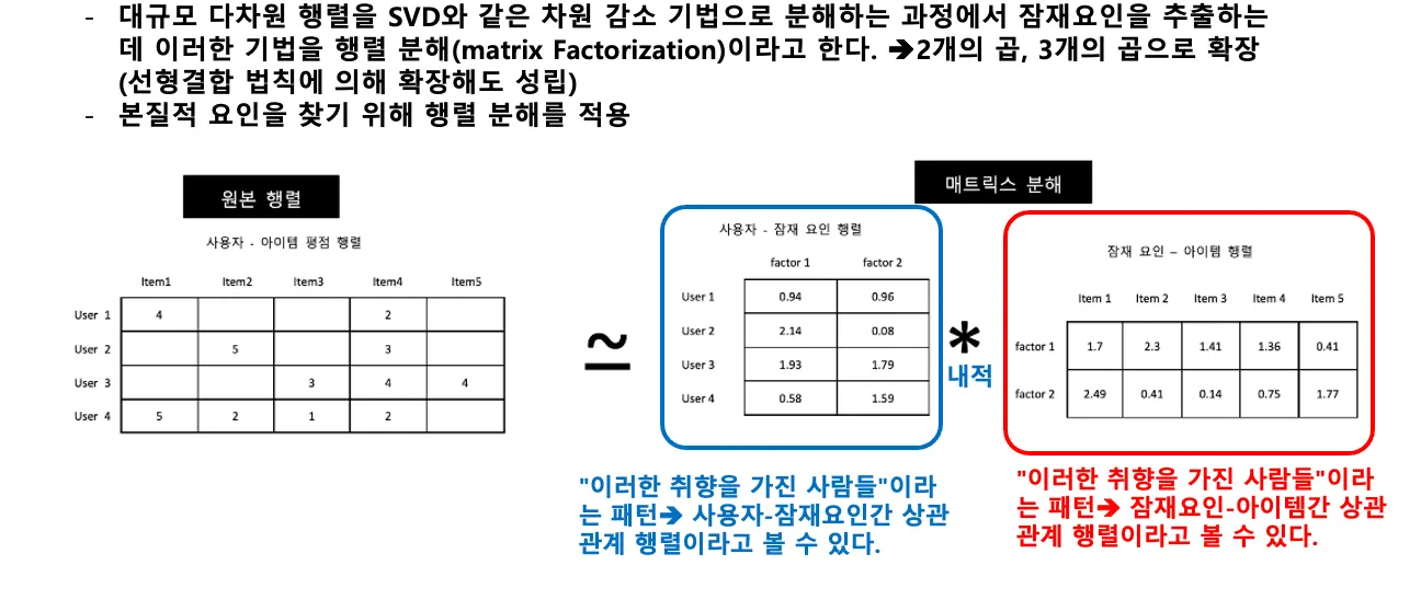 잠재요인 기반 협업 필터링 : 사용자- 아이템 평점 매트리스 속에 숨어있는 잠재요인을 추출해 추천 예측을 할 수 있게 하는 기법