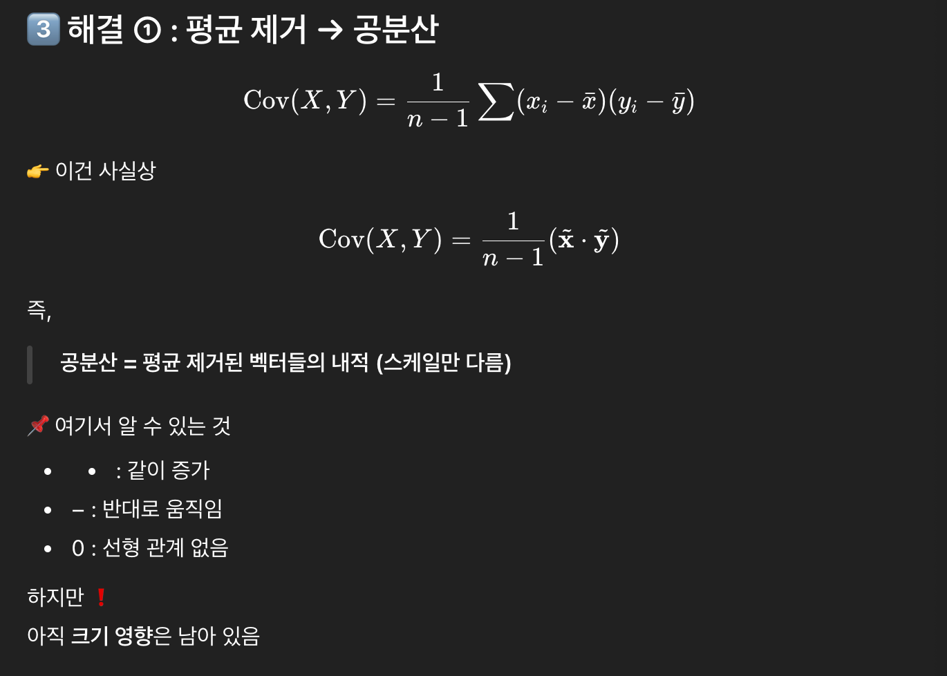 - 공분산은 평균 제거 o, 1/(n-1) 스케일 있음
