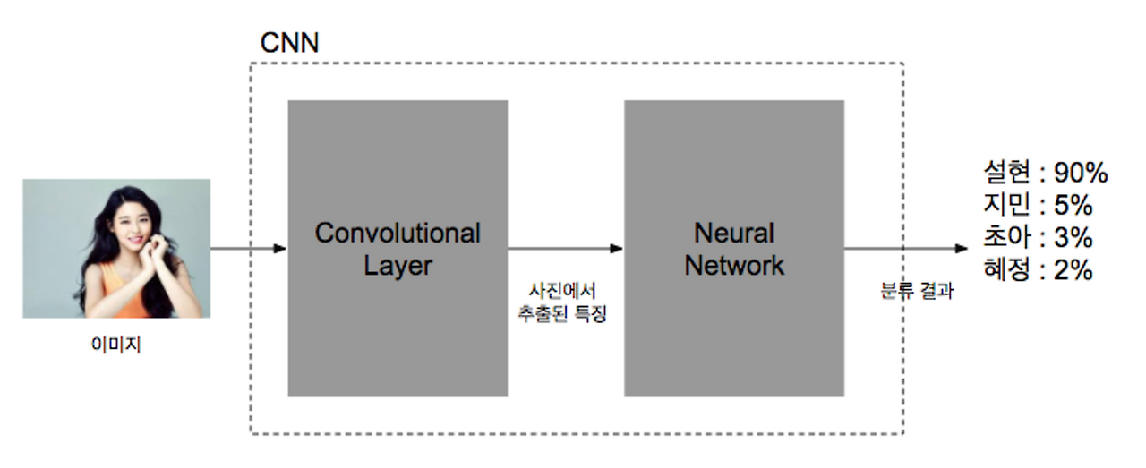 이미지 → 특징 추출 → 분류 → 확률 출력의 흐름으로 작동