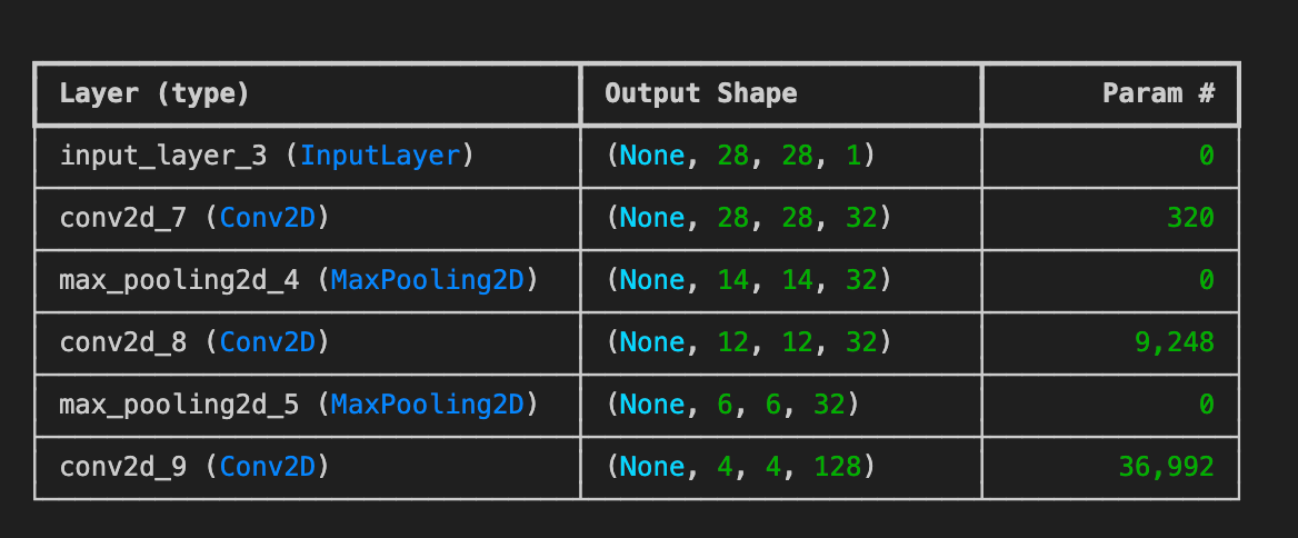 28×28×1 → 28×28×32 → 14×14×32 → 12×12×32 → 6×6×32 → 4×4×128