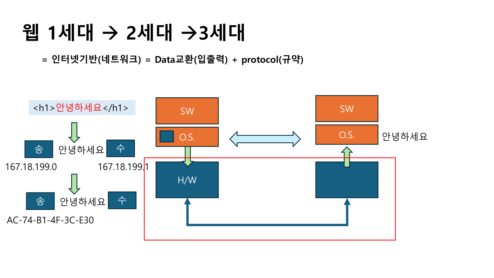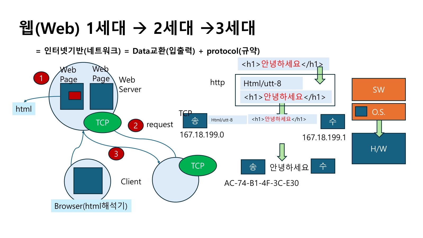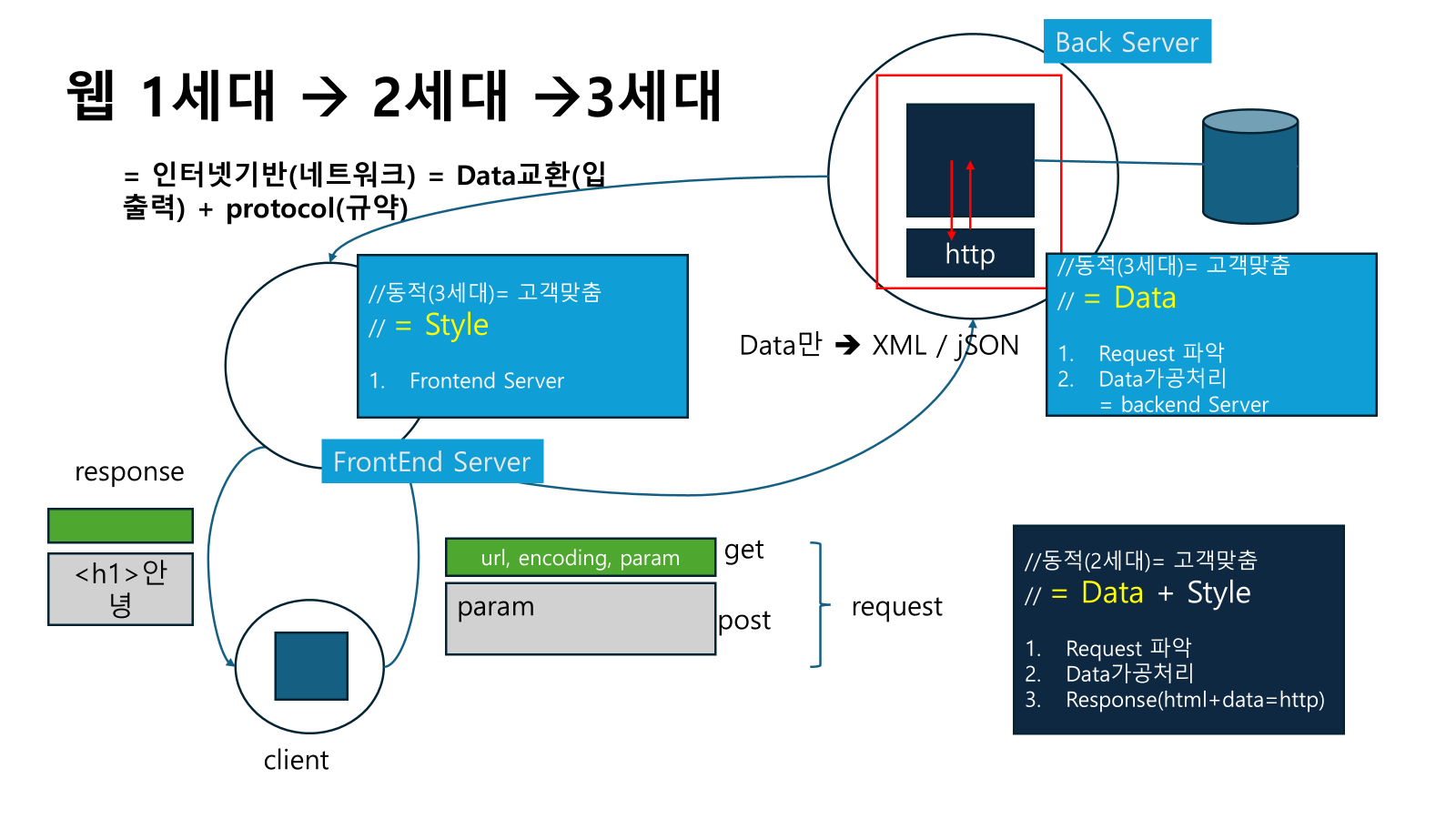 - ⇒ 웹 1세대는 HTML 문서 전달 중심의 구조